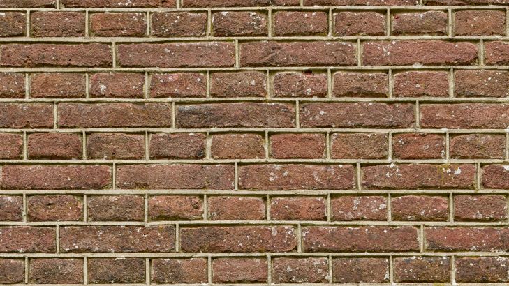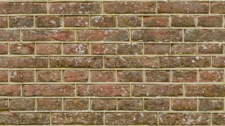 Muro di vecchi mattoni con stuccatura pulita. La parte inferiore del muro è verde a causa del muschio.