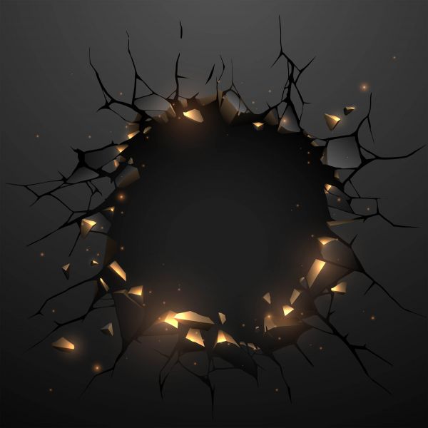 Parete nera astratta con un buco. I pezzi che si staccano dal muro sono color oro.