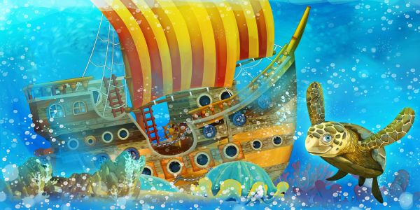 Mondo sottomarino con una nave pirata affondata nella barriera corallina con una tartaruga.
