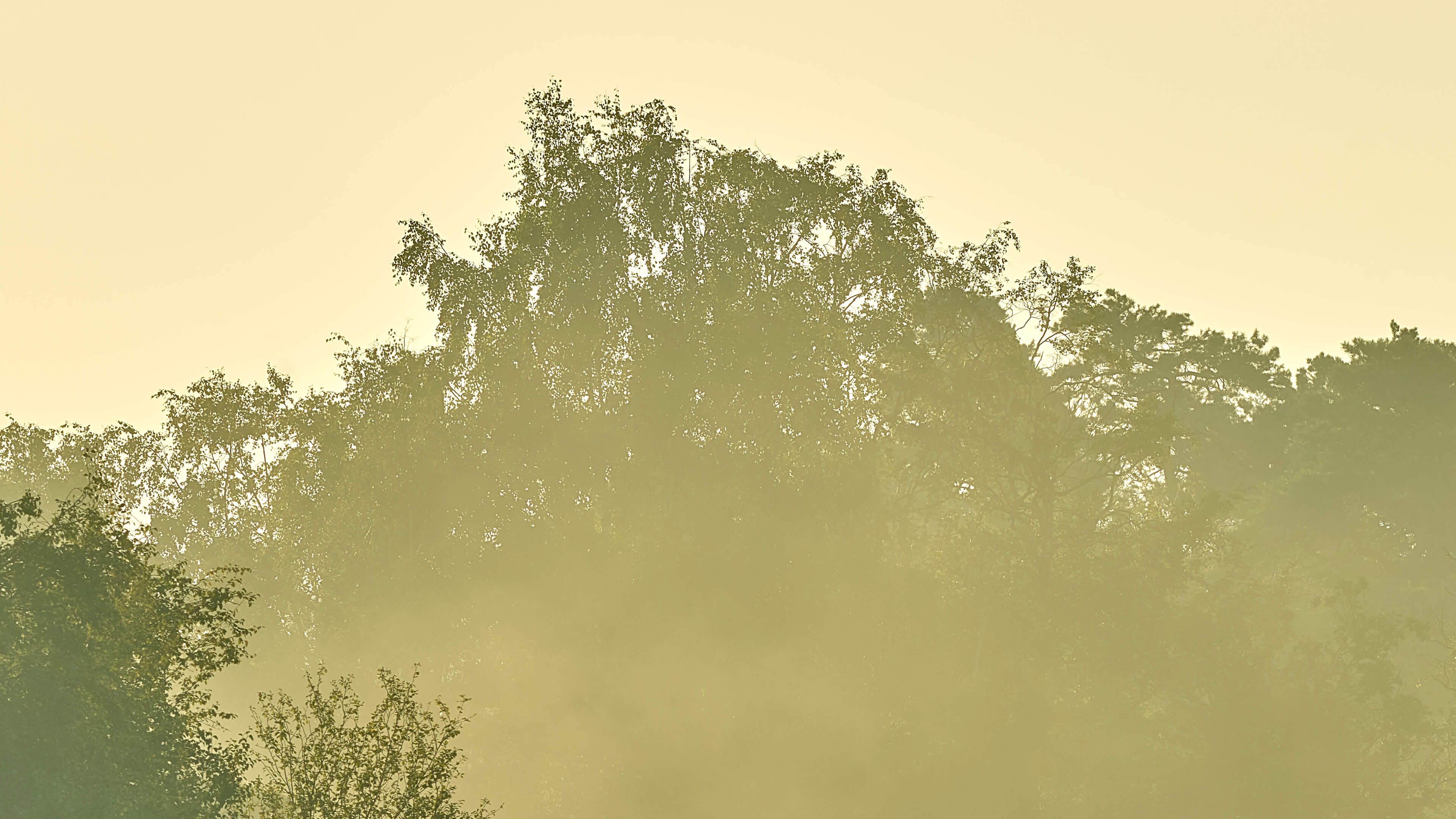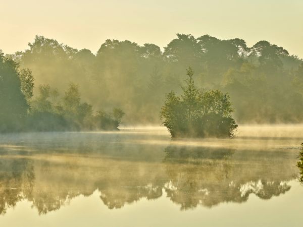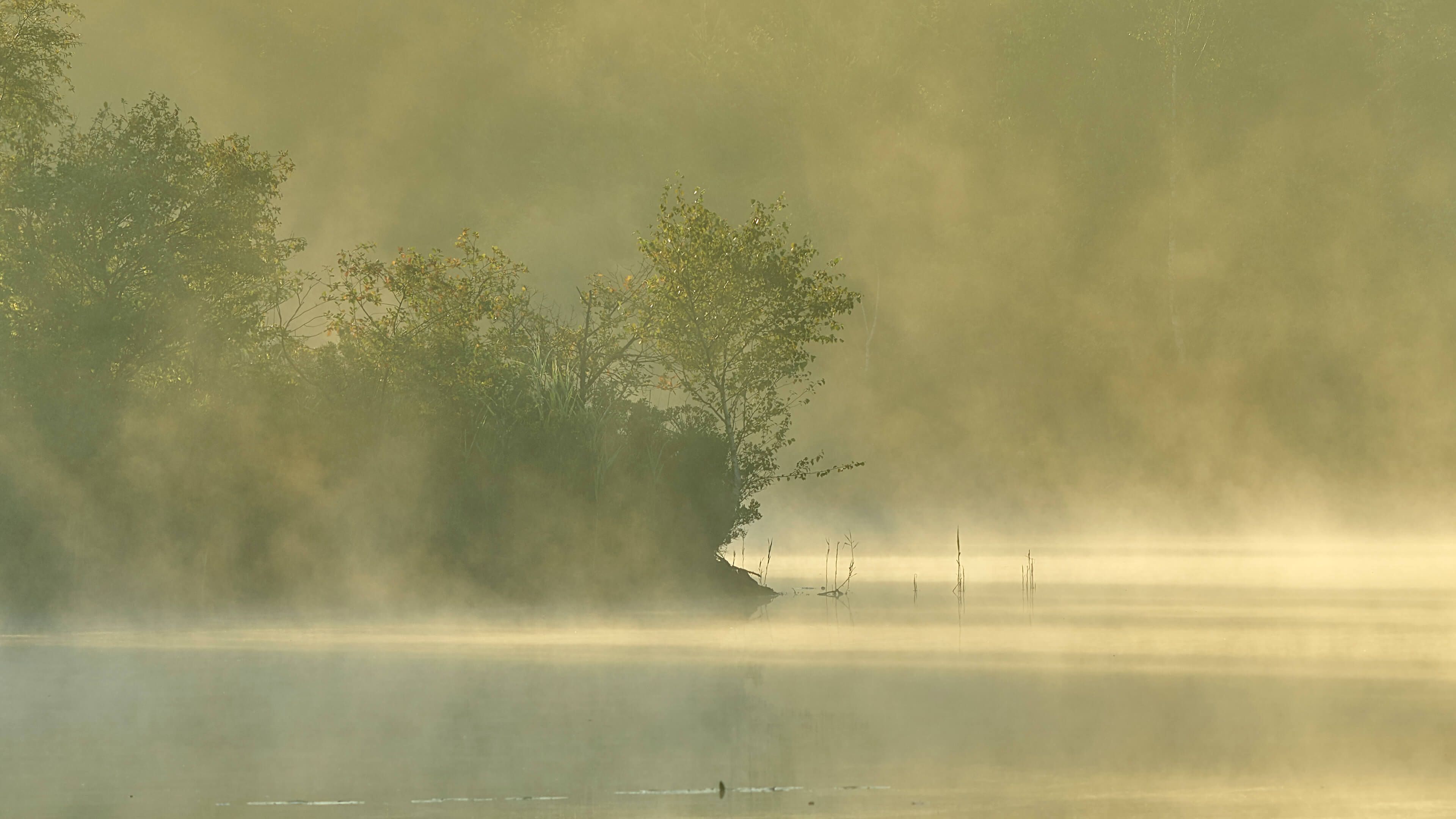 Nebulosa sopra un lago forestale in diversi materiali