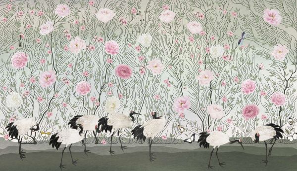Una escena elegante con majestuosas grullas rodeadas de delicadas rosas y flores. Los sutiles tonos de rosa y verde crean una atmósfera serena y refinada, realzada por los elegantes detalles de flores y hojas. Las mariposas y libélulas añaden un toque de elegancia al diseño.