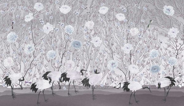 Una escena elegante con majestuosas grullas rodeadas de delicadas rosas y flores. Los sutiles tonos de rosa y verde crean una atmósfera serena y refinada, realzada por los elegantes detalles de flores y hojas. Las mariposas y libélulas añaden un toque de elegancia al diseño.