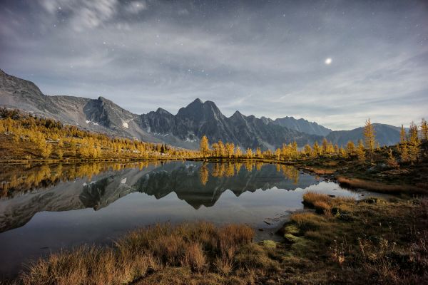 Un'immagine di cime di montagna con un lago delimitato da alberi. Anche le stelle sono già visibili.