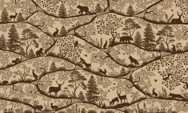 Questa suggestiva illustrazione mostra un paesaggio boschivo ricco e stratificato, composto da rami d'albero elegantemente intrecciati che scorrono orizzontalmente nell'immagine. Tra questi rami compaiono silhouette di diversi animali della foresta, come maestosi cervi, orsi tranquilli, lupi vigili e piccole lepri. Dettagli fini di pini, cespugli, felci e uccelli garantiscono un insieme giocoso e vivace. L'illustrazione ha un carattere grafico, in cui la ripetizione di forme e linee crea un motivo ritmico che risulta al tempo stesso rilassante e decorativo. La tavolozza di colori caldi, sabbia-beige e profonde tonalità cioccolato, potenzia la sensazione naturale e senza tempo. In un arredo dallo stile rurale questa illustrazione forma una base armoniosa, soprattutto in combinazione con mobili in legno, tessuti simili alla lana e accessori in tonalità terre come terracotta, taupe e crema. All'interno di un interior moderno o japandi il disegno può servire come un forte accento stilistico che si armonizza con forme minimaliste, legni chiari e dettagli sottili neri o marrone scuro. Grazie al motivo continuo e ai contrasti tranquilli, questa illustrazione si adatta a diversi ambienti, come soggiorno, camera da letto o studio, dove aggiunge un'atmosfera naturale e rilassata. Anche in un ingresso o in una zona pranzo il design può creare un insieme caldo e accogliente. Abbina con piante, trame di lino e illuminazione soffice per potenziare la serena esperienza forestale.