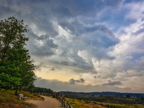 Nuvole a forma di tempesta con una panchina nel paesaggio. Combinate questa carta da parati con foto nella vostra casa per un'atmosfera ancora maggiore.