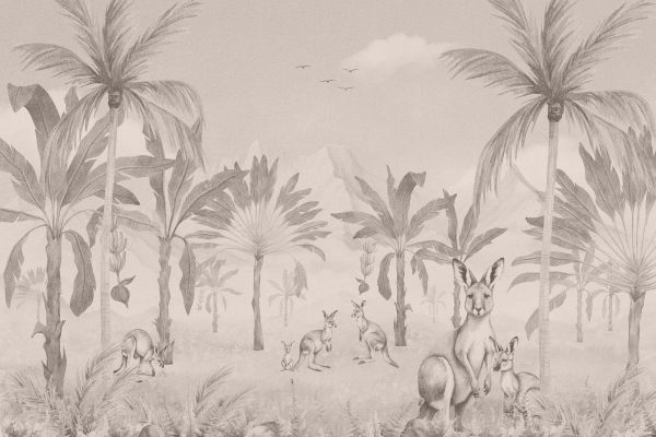 Una sottile rappresentazione di canguri che si godono l'ombra sotto una collezione di palme tentacolari, il tutto in una morbida scala grigia che suggerisce pace e unità con la natura.