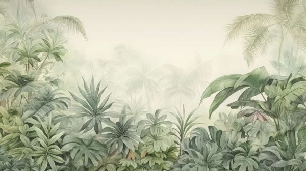Una sottile collage di fogliame tropicale, realizzato in toni di verde e bianco smorzati, che conferisce un'aura calma e pura. La delicata sfumatura e le transizioni fluide tra le foglie suggeriscono un ambiente sereno e dolce.