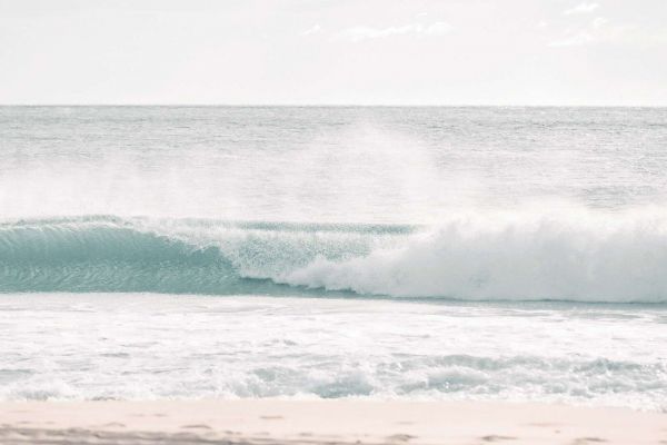 Una fresca onda si infrange sulla spiaggia, catturata in un delicato turchese e bianco brillante. L'atmosfera leggera e soleggiata trasmette calma e apertura estiva.
