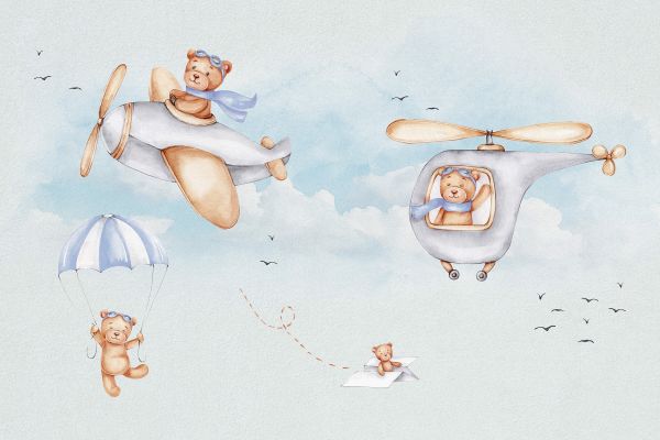 Orsi allegri e colorati si divertono in aria. Questa carta da parati è perfetta per la camera dei bambini o dei neonati.