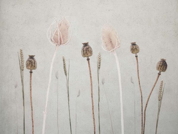 Questa immagine porta in casa l'essenza di un campo tranquillo con la sua collezione di bulbi di papavero ed erbe secche. Lo sfondo grigio ruvido contrasta con la delicata consistenza delle piante, creando un'esperienza visiva e tattile accattivante. La diversità di forme e texture invita a un senso di serenità e bellezza naturale.