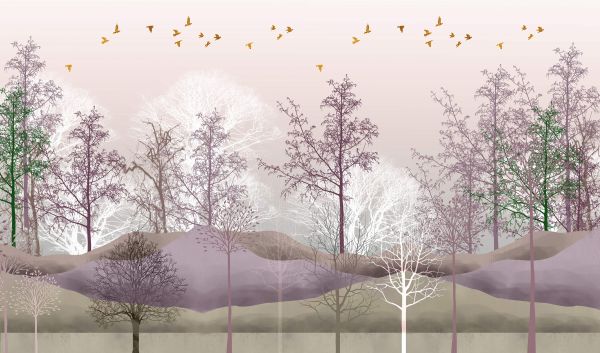 Paesaggio con alberi e uccelli colorati. Trasformate la vostra parete in un vero e proprio colpo d'occhio con questa carta da parati.