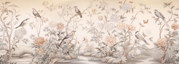 Questo disegno riflette un paesaggio morbido, quasi sognante, dove eleganti uccelli canori si mescolano con un'abbondanza di crisantemi in fiore e altra flora.