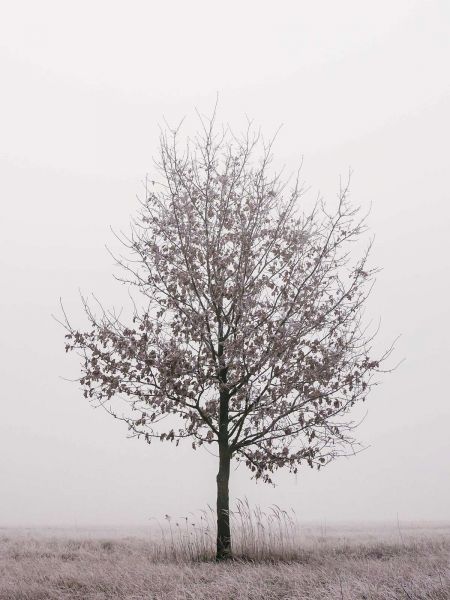 Un albero solitario si erge in un paesaggio nebbioso, i suoi rami spogli avvolti delicatamente dalla nebbia. La composizione minimalista e le morbide tonalità di grigio trasmettono un senso di calma e silenzio.