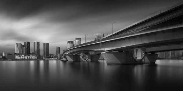 Uno skyline con alti edifici per uffici in bianco e nero. Sulla destra c'è un ponte che mostra la strada per la città.