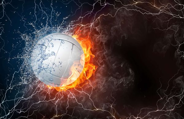 Immagine 3D di una pallavolo con acqua e fuoco.