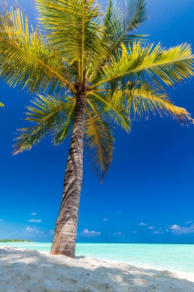 Spiaggia tropicale alle Maldive con palme e mare azzurro.