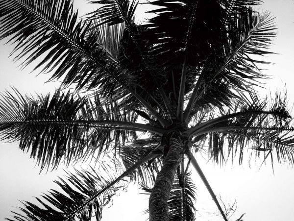 Un potente silhouette di una palma contro un cielo limpido, catturata in contrasto in bianco e nero. Le foglie spiegate formano un pattern dinamico che unisce calore tropicale ed eleganza grafica.