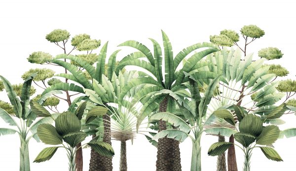 Palme dipinte ad acquerello di diversi tipi su uno sfondo bianco.