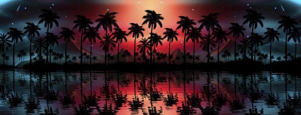 Paesaggio notturno con palme con un cielo rosso e stelle sull'acqua