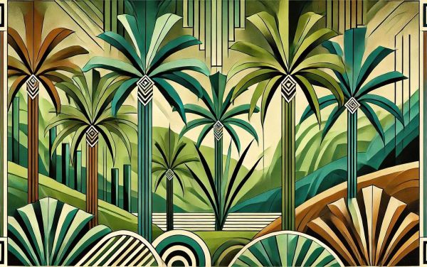 Palme stilizzate si ergono in un paesaggio ritmico pieno di geometrie, toni verdi e motivi grafici. Il design combina l'opulenza tropicale con l'eleganza essenziale dell'art déco.