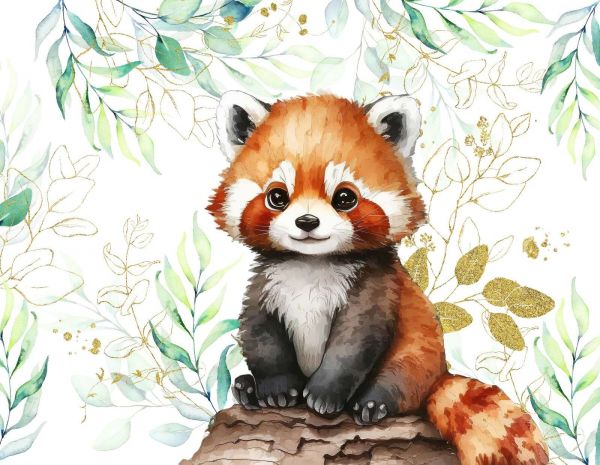 Questo incantevole design porta in vita il fascino del panda rosso in un ambiente giocoso e sereno. Il tenero panda, con il suo pelo soffice in calde tonalità di rosso-bruno, arancione e bianco, si siede comodamente su un tronco d'albero e guarda il mondo con grandi occhi scintillanti. Lo sfondo è decorato con eleganti foglie in stile acquerello in tonalità di verde e blu, arricchite da sottili accenti dorati che aggiungono un tocco di eleganza.