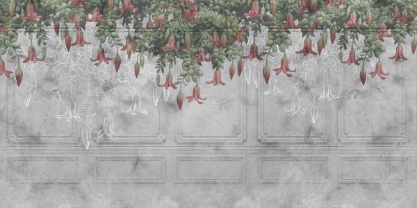 Clásico panel 3D gris con flores colgando de la parte superior en verde y rojo.