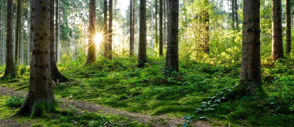 Un bel panorama della foresta in primavera con un sole luminoso che brilla attraverso gli alberi.