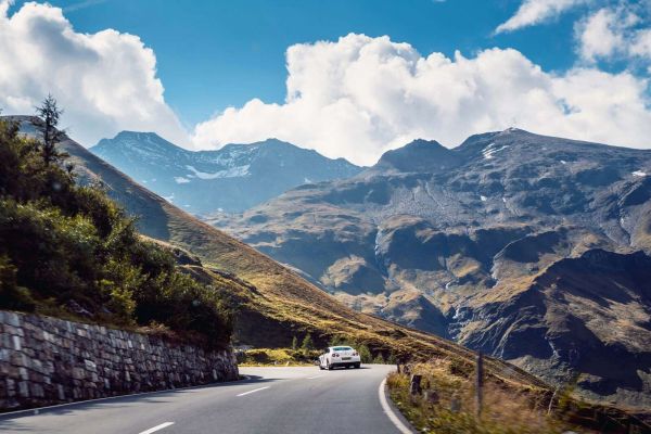 Un paesaggio montano pittoresco con una strada tortuosa che si snoda tra imponenti formazioni rocciose e colline verdi. Un'auto sportiva bianca percorre rilassata il panorama mozzafiato, circondata da maestose montagne e nuvole che fluttuano graziosamente nel cielo blu chiaro. La combinazione perfetta di avventura e natura serena.