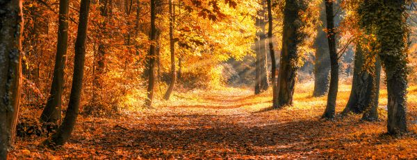 Un panorama di una foresta autunnale con il sole che splende attraverso gli alberi.