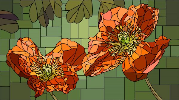 Papaveri arancioni con effetto vetrata su carta da parati fotografica. Questa arte floreale astratta crea immediatamente più atmosfera nella vostra stanza.