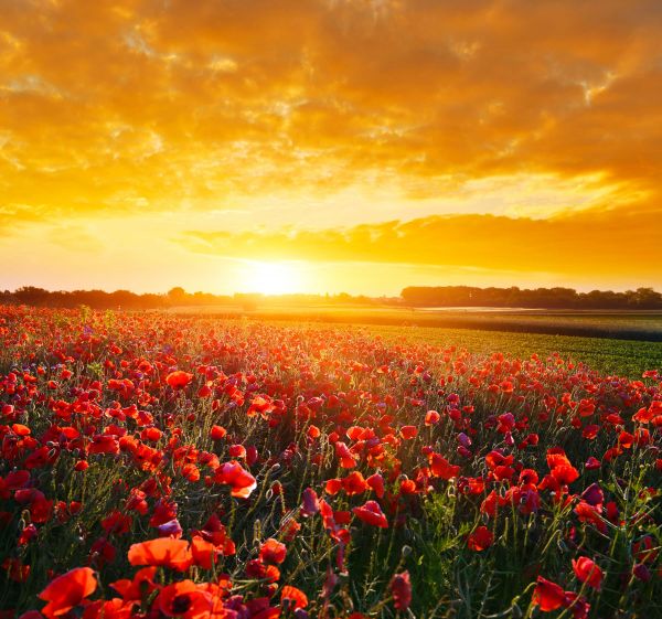 Un bel campo di papaveri rossi con un cielo arancione durante un tramonto.