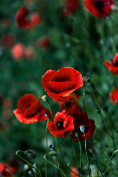 Un'immagine dettagliata di papaveri rossi su uno sfondo di erba verde.