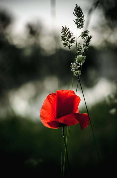 Papavero rosso con un filo d'erba nel campo. Un primo piano acuto di un papavero con uno sfondo sfocato.