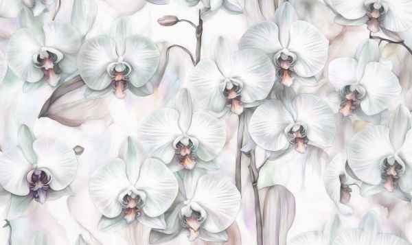 L'armonia contrastante tra il profondo verde scuro e i fiori bianchi brillanti conferisce a questo design un aspetto lussuoso e quasi teatrale. Le orchidee sembrano fluttuare come gioielli preziosi contro lo sfondo scuro, mentre tonalità verdi ricche e sottili nelle foglie e nei gambi aggiungono ulteriore profondità. Questo design può essere un vero punto focale in un ambiente moderno e minimalista, dove l'intensità del verde scuro si esprime accanto a mobili lineari e accenti metallici. Anche in un interno in stile classico o art déco, il motivo aggiunge drammaticità e raffinatezza, soprattutto se abbinato a tessuti morbidi come il velluto e legni scuri. Le profonde tonalità di verde creano una sensazione di accoglienza e lusso, rendendo questo design perfetto per esempio per un elegante soggiorno o una camera da letto principale. Con un'illuminazione raffinata e accessori dorati o in rame sottili, puoi ulteriormente intensificare l'atmosfera lussuosa, mentre tonalità neutre mantengono l'insieme in equilibrio.