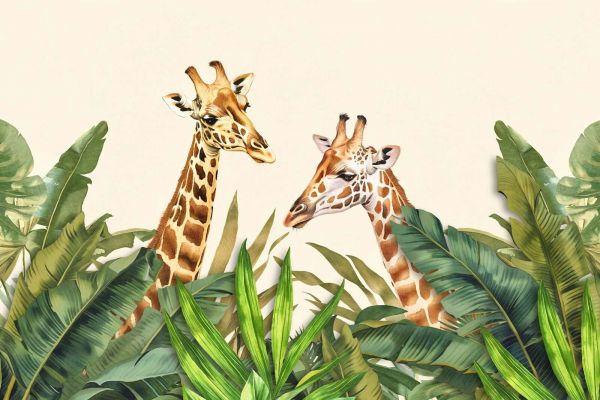 Un’elegante e calda illustrazione da parete di due giraffe in morbide tonalità acquerello. I colori naturali e i sottili accenti fogliari creano un’atmosfera rilassante e raffinata, con un tocco di fascino safari.