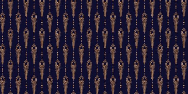 Un motivo elegante di piume di pavone, realizzato in oro su uno sfondo blu notte, crea una sensazione di profondità e lusso.