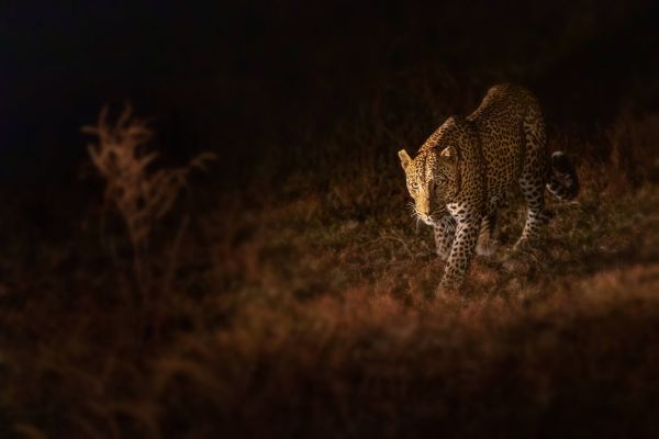 Un ghepardo che si aggira nella notte camminando la sua pattuglia.