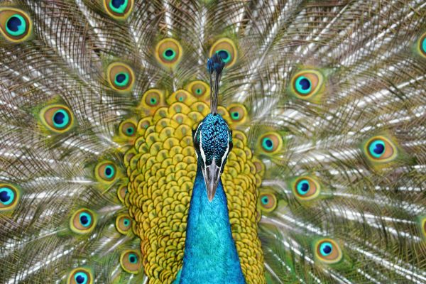 Un primo piano della vista frontale di un pavone. I bellissimi colori giallo e blu aggiungono maggiore atmosfera alla casa.