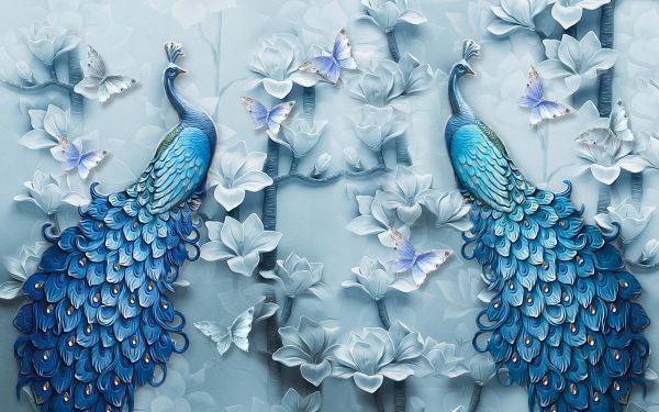 Sfondo fotografico di due pavoni blu con farfalle sullo sfondo.