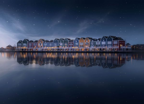 Una bella serata tranquilla nei Paesi Bassi con belle case colorate in riva al mare sotto le stelle.