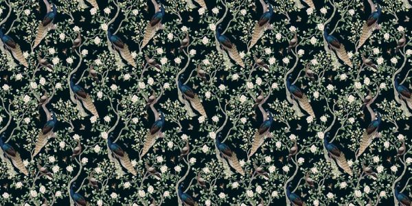 Pavoni reali con il loro piumaggio sorprendente adornano lo sfondo verde scuro, circondati da fiori bianchi in fiore. Questa composizione elaborata di bellezza naturale è sia lussureggiante che elegante, con gli uccelli e la flora in perfetta armonia.