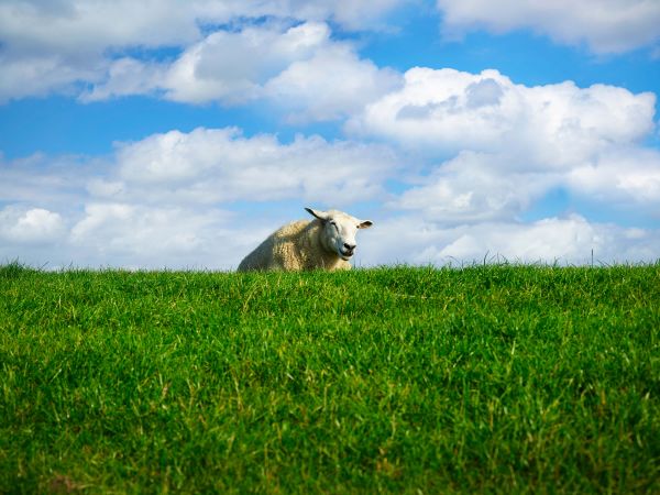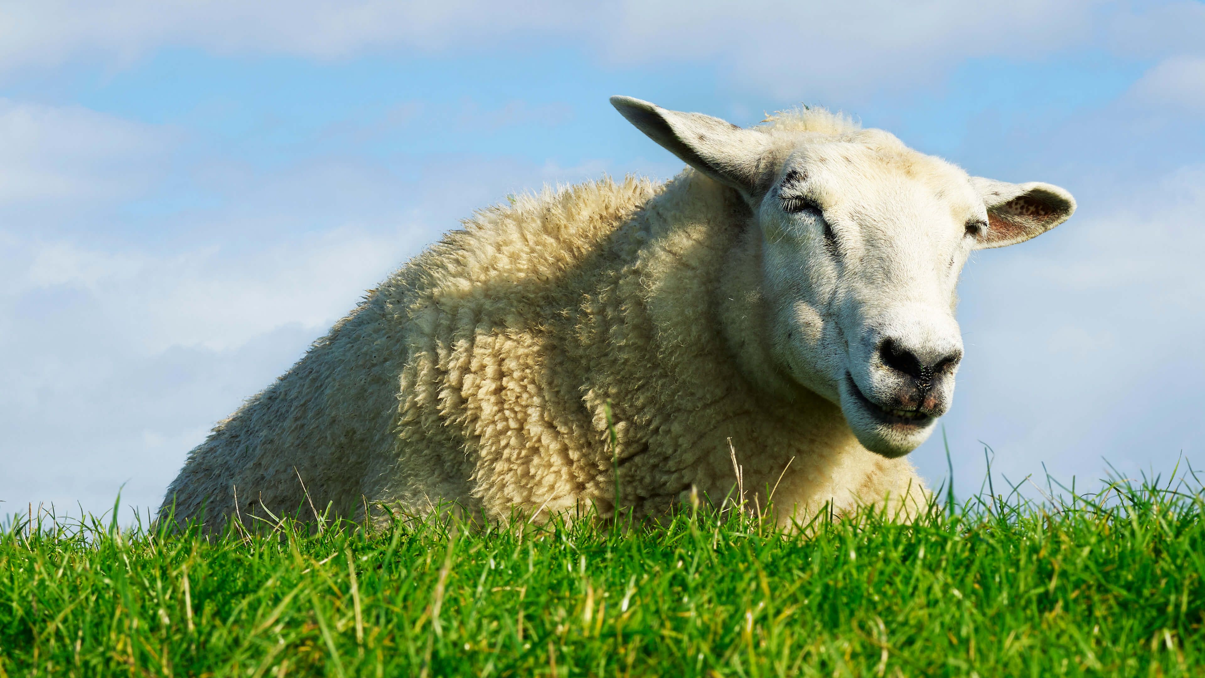 Pecore distese su una diga piena d'erba durante un giorno d'estate.