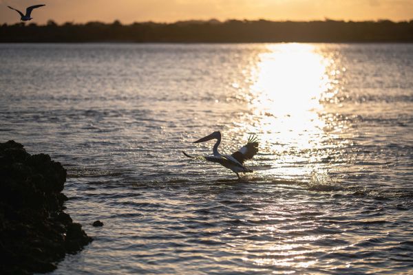 Sfondo fotografico di pellicani nel mare durante il tramonto. Combinatela in casa per creare più atmosfera.