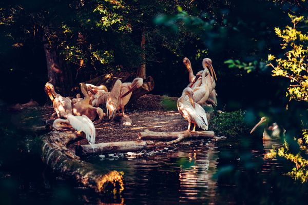 Sfondo fotografico di un gruppo di pellicani in uno zoo. Combinatela in casa per creare più atmosfera.