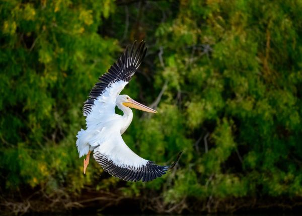 Immagine di un pellicano bianco in volo con alberi sullo sfondo. Combinare a casa.