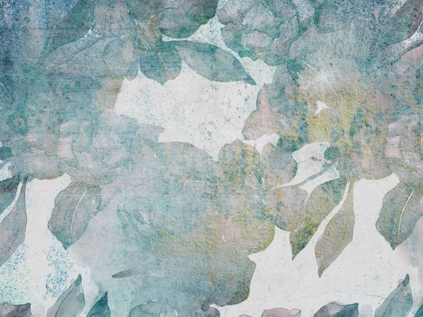 Grandi peonie e foglie eleganti fluttuano in un decor aquarellato a strati con morbide tonalità di blu, bianco invecchiato e tocchi di verde dorato. La struttura trasparente conferisce all'insieme un aspetto arioso e poetico.