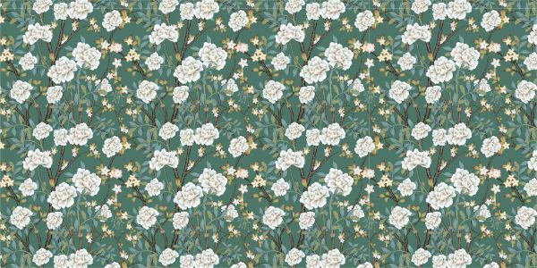 Un ricco arazzo di rose da giardino sboccia su un tranquillo sfondo verde, con tonalità che vanno dal giada intenso al verde pastello. I rami scuri offrono un forte contrasto, mettendo ulteriormente in risalto i petali bianchi e puri.