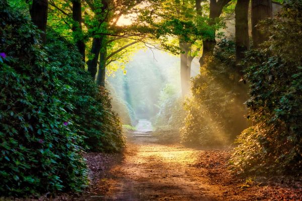 Un sentiero magico della foresta, illuminato dai raggi del sole.