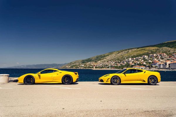 Due iconiche Ferrari gialle, la 488 GTB e la F430 Scuderia, emanano pura potenza ed eleganza sulla costa soleggiata. Il mare azzurro e le pittoresche colline formano il perfetto sfondo per questi capolavori italiani.