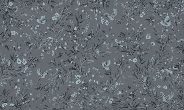 Gli uccelli fluttuano tra fiori delicati e motivi fogliari su uno sfondo elegante blu-grigio. I contrasti tranquilli e le sottili tonalità grigio-verdi conferiscono al design un'atmosfera calma, classica e suggestiva.